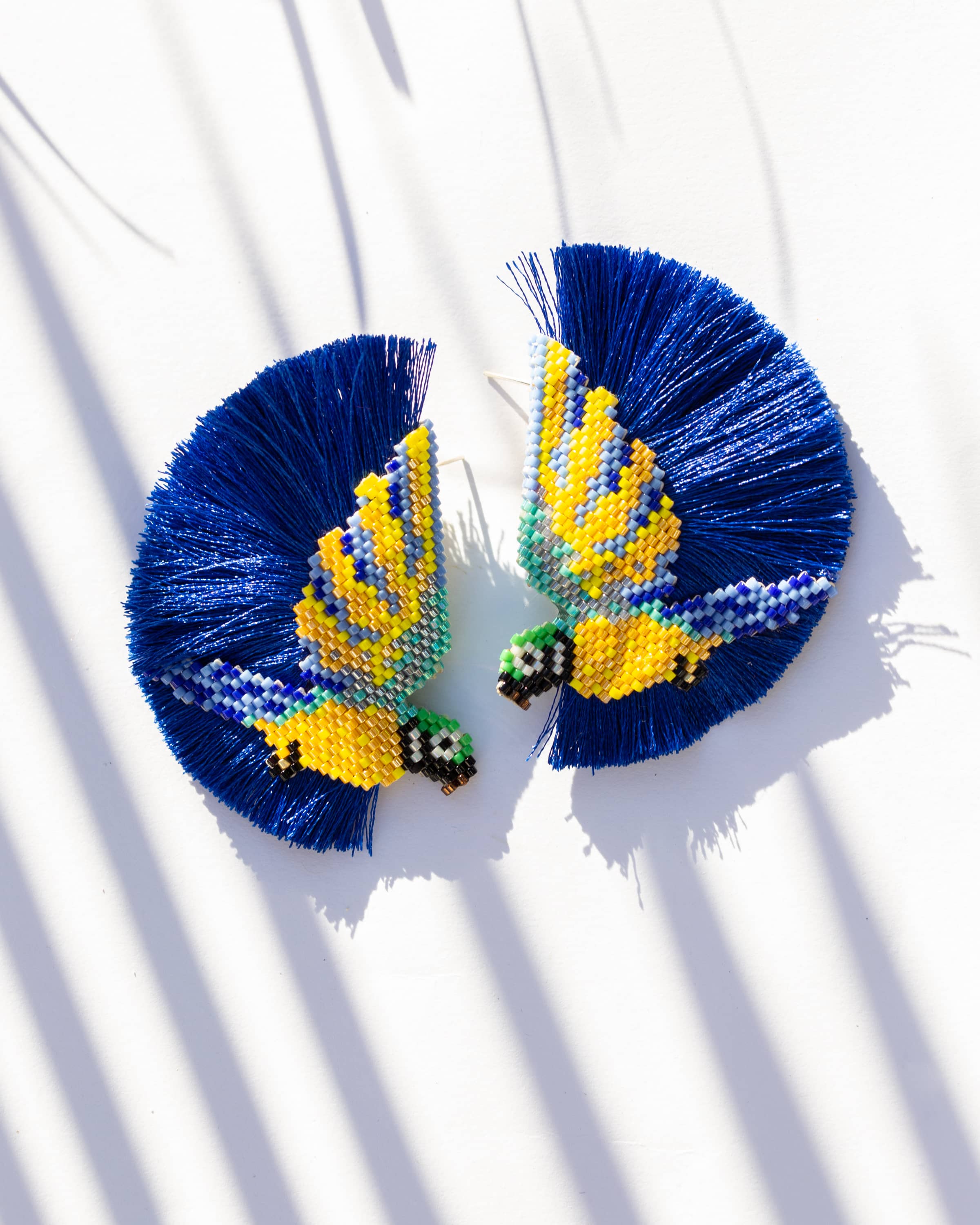 Aretes en forma de Guacamaya bordados en cristal japonés montados sobre mota en hilo de seda y poste de plata 925.